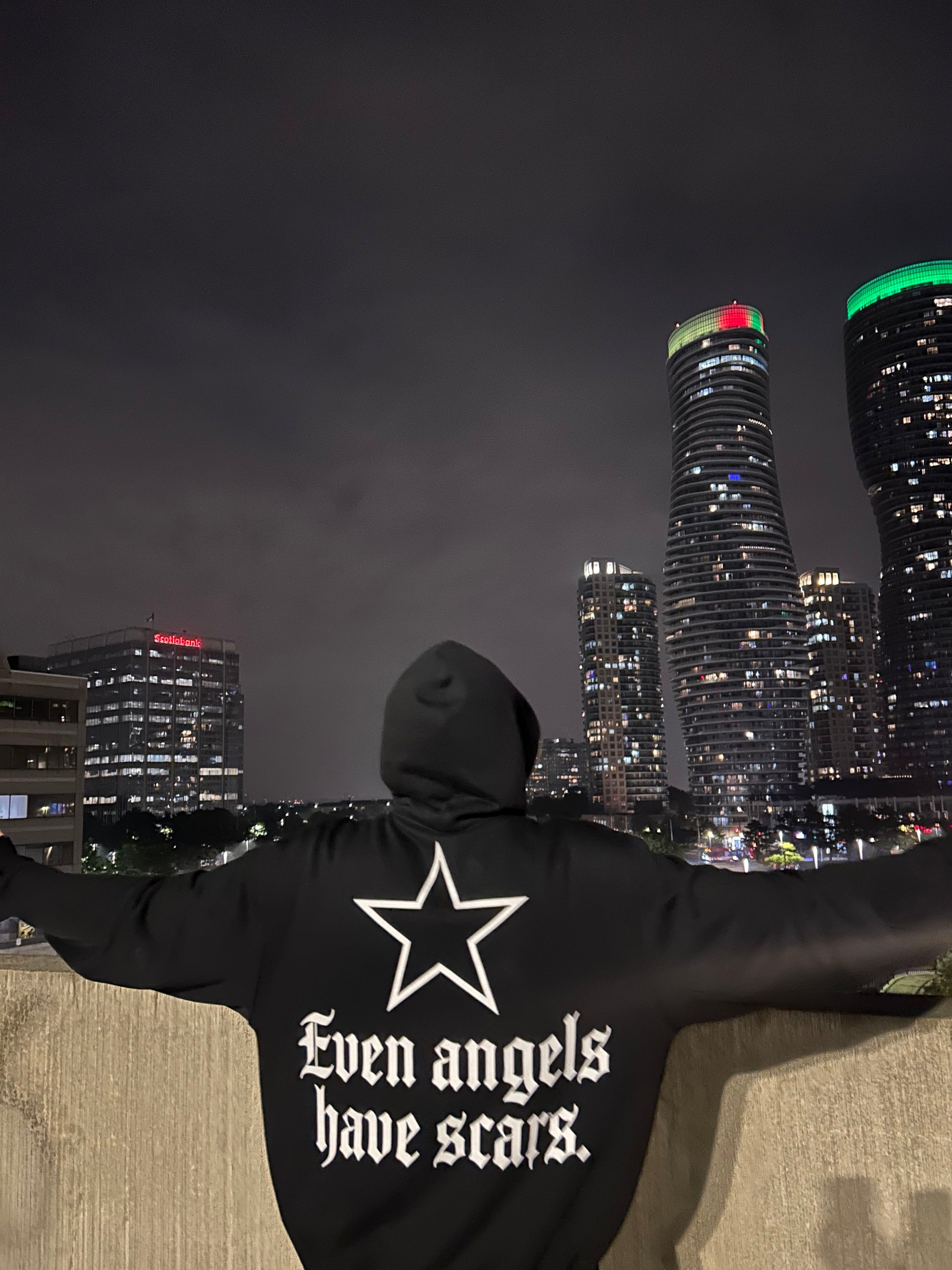 This premium black full hooded zip-up features a striking front graphic of a serene, radiant angel—graceful yet powerful. On the back, a bold star and raw truth: "Even angels have scars." It’s a reminder that everything you want in life comes with battle.